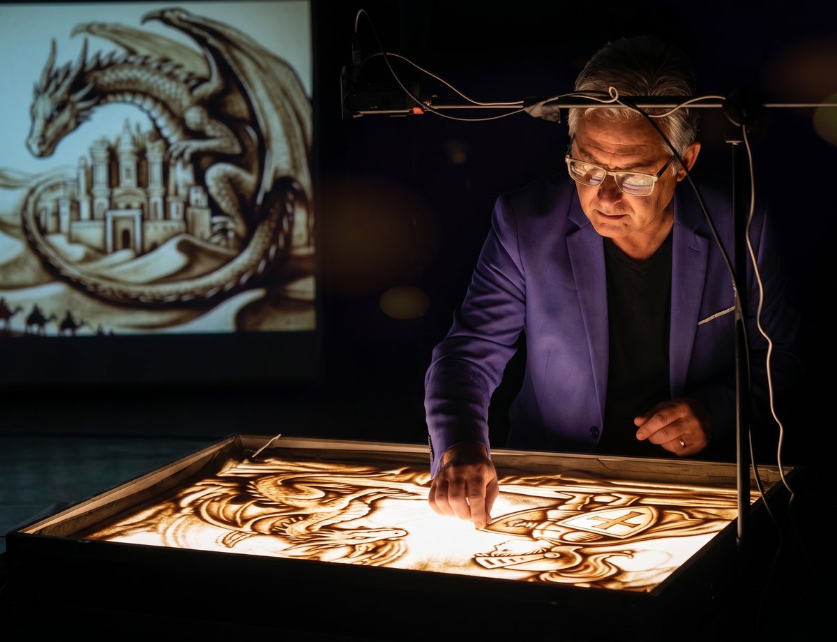 Watch as Toni Ortiz draws the legend of Saint George with sand on a glowing light table, conjuring dragons, princesses, and heroes that appear and dissolve before your eyes.